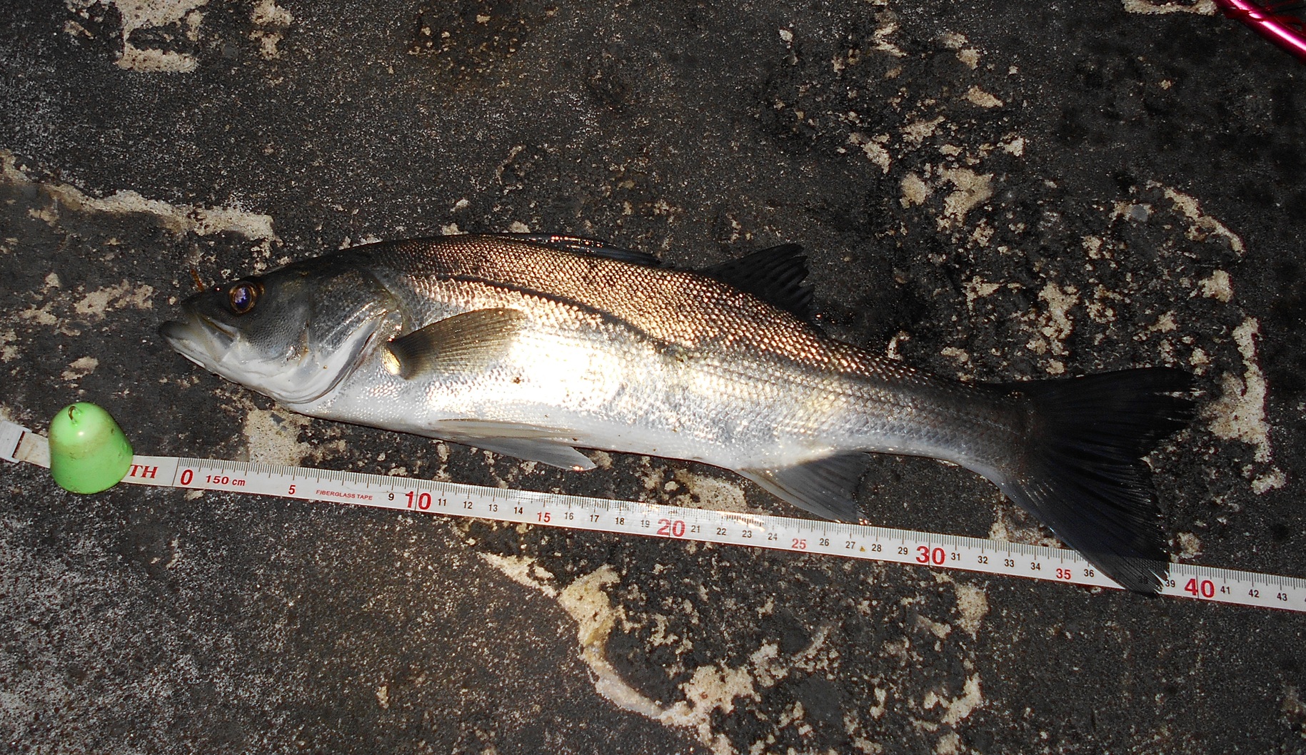 - キャストするとヒット! いい手ごたえ! 上がってきたのは、マルスズキです! 体高もあって、力強