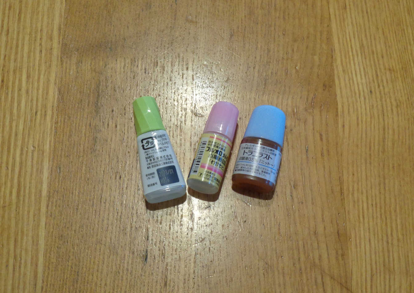 - で、眼を保湿して、眼を保護しつつ、アレルギーを抑える薬を2種類。ピンクのキャップは、症状がヒドイ時に……ということで、